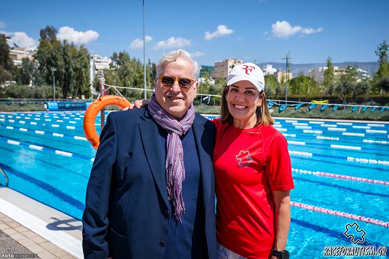 Η Πρόεδρος και Ιδρύτρια της Race for Autism Gr, Άδα Σταματάτου με τον προπονητή και υπεύθυνο του Κολυμβητηρίου Καλλιθέας, κ. Τάσο Καράμπελα